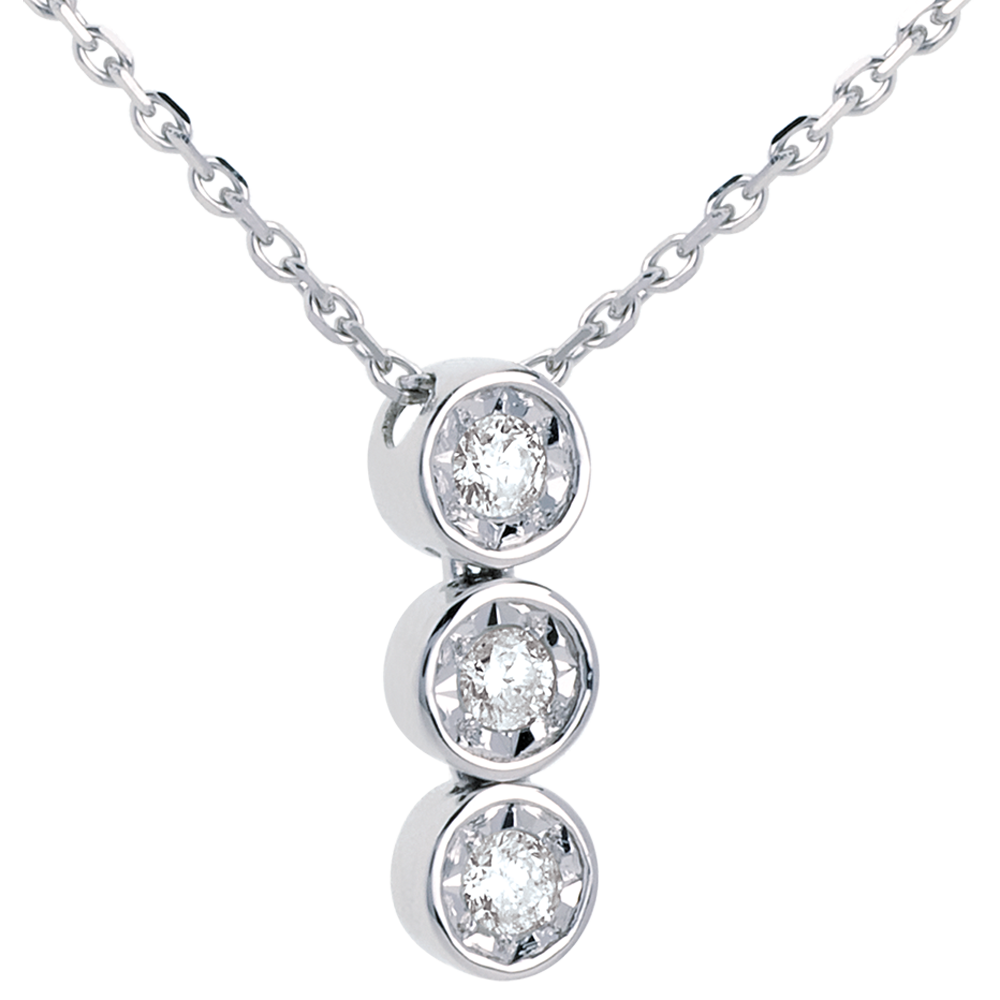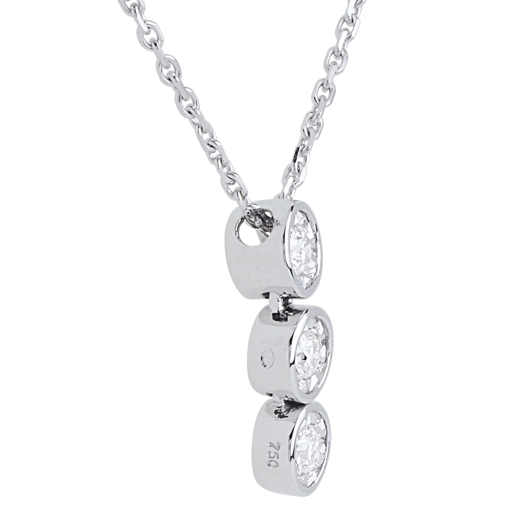 Diese funkelnde Trilogie unterstreicht dezent das Dekolleté. Mit Goldkette 40cm 750/1000. Mit Kette 42 cm + Verlängerung von 3 cm; 750/-. 3 Diamanten : 0.12 Karat - Weißgold (750/-): 2.4 g. Weitere Abmessungen