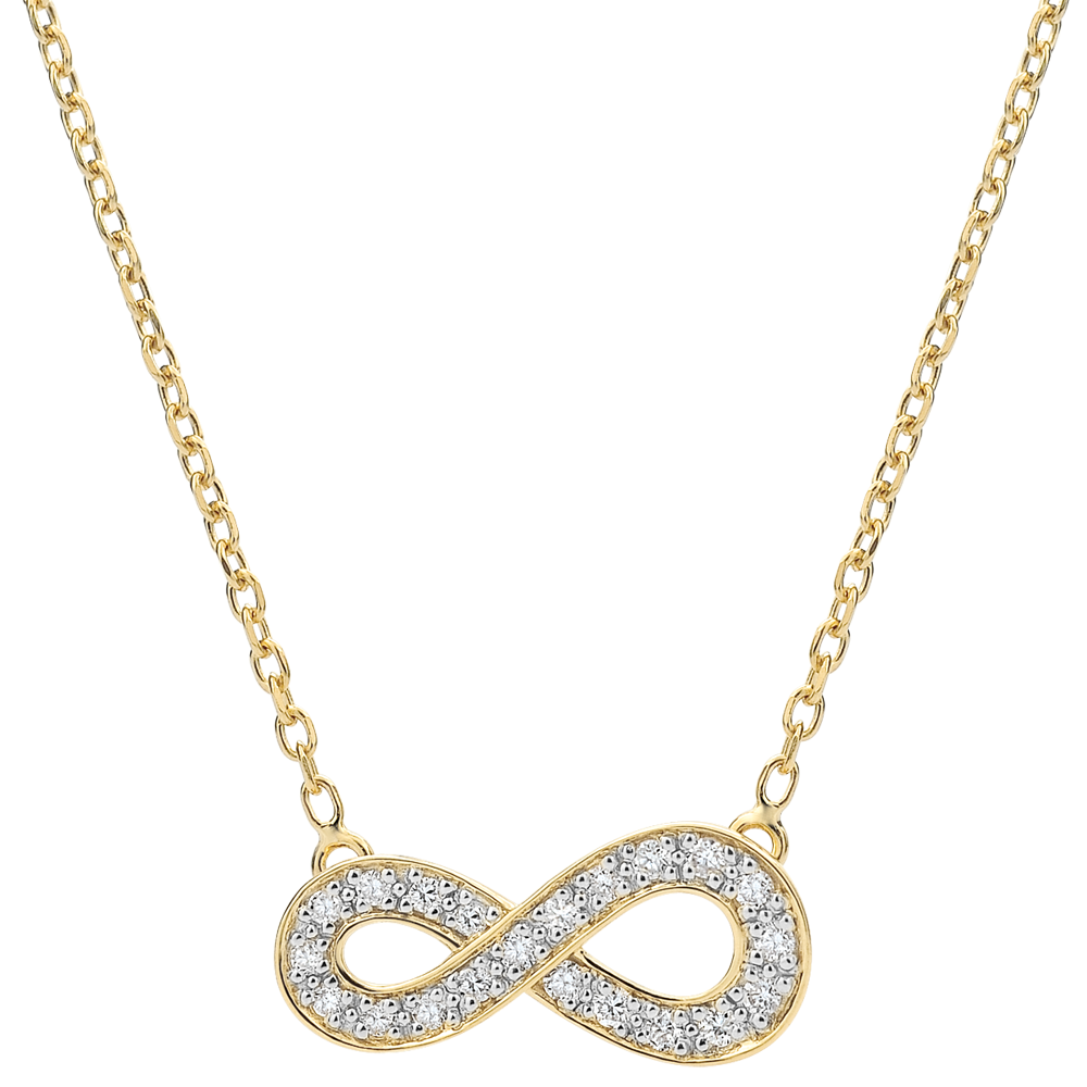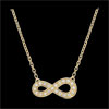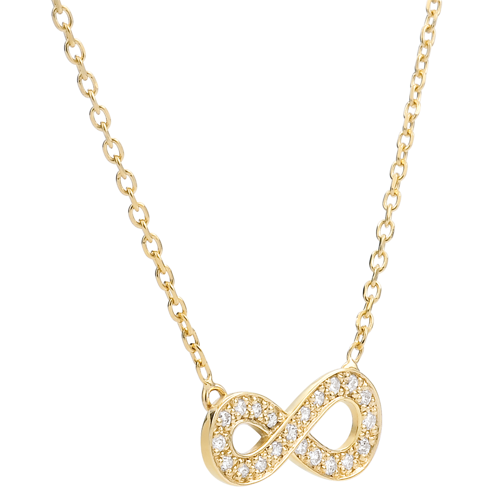 Das Zeichen der Unendlichkeit strahlt in edlem Gelbgold und mit Diamanten besetzt an einer erlesenen Kette. Es symbolisiert auf elegante Weise die Ewigkeit und die Unvergänglichkeit.