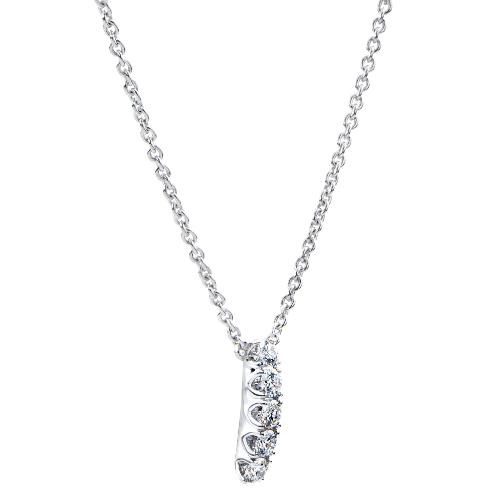 Eine Patrone mit 5 Diamanten auf einer 42 cm langen Kette (+ 3 cm Verlängerung), für einen feinen Anhänger, der sich diskret in Ihre Halsmulde schmiegen wird. Mit Kette 42 cm + Verlängerung von 3 cm; 750/-. 5 Diamanten : 0.19 Karat - Weißgold (750/-): 3.1 g. Weitere Abmessungen