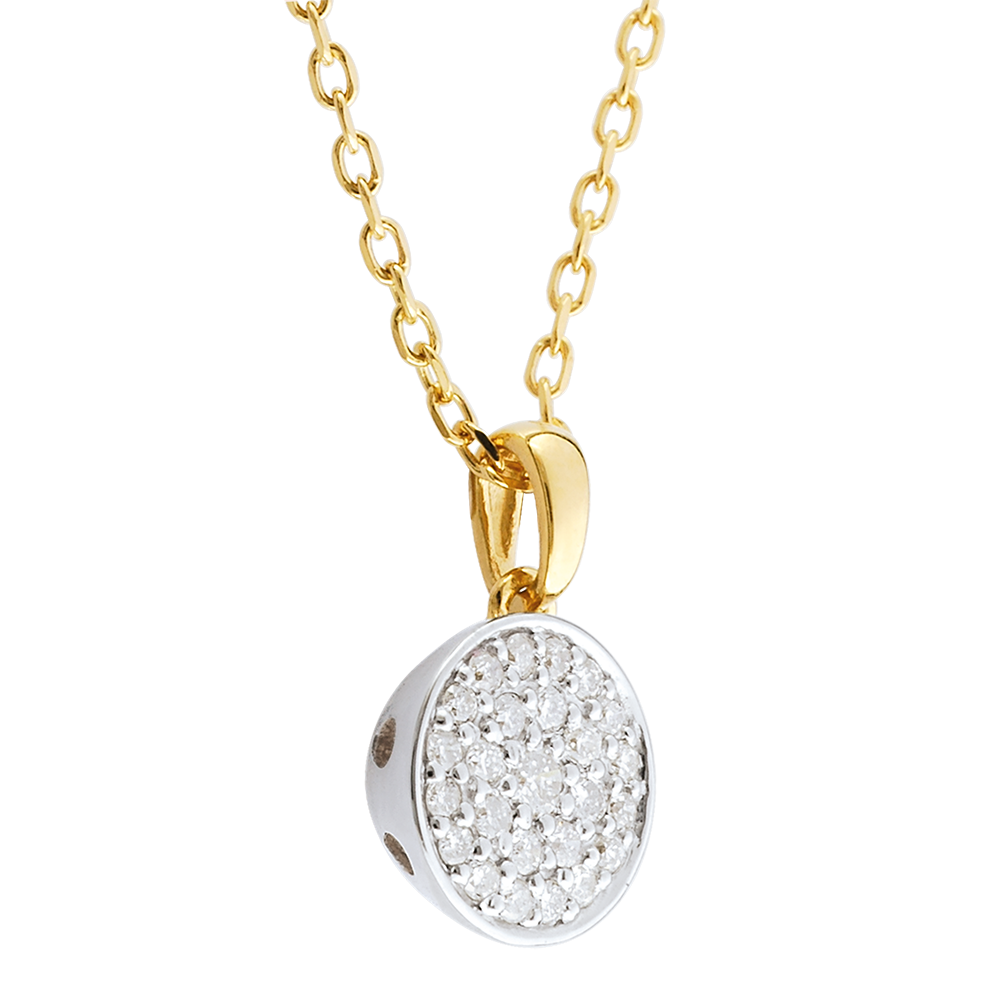 Eine Konstellation von Diamanten, geballt an einem Anhänger, der in vollem Glanze funkelt. Mit Kette von 42cm Länge und 3cm Verlängerung. Mit Goldkette 750/-. Mit Kette 42 cm + Verlängerung von 3 cm; 750/-. 25 Diamanten : 0.16 Karat - Weiß-und Gelbgold (750/-): 2.5 g. Pavé aus natürlichen Diamanten : 25 - Total: 0.163 Karat Weitere Abmessungen