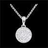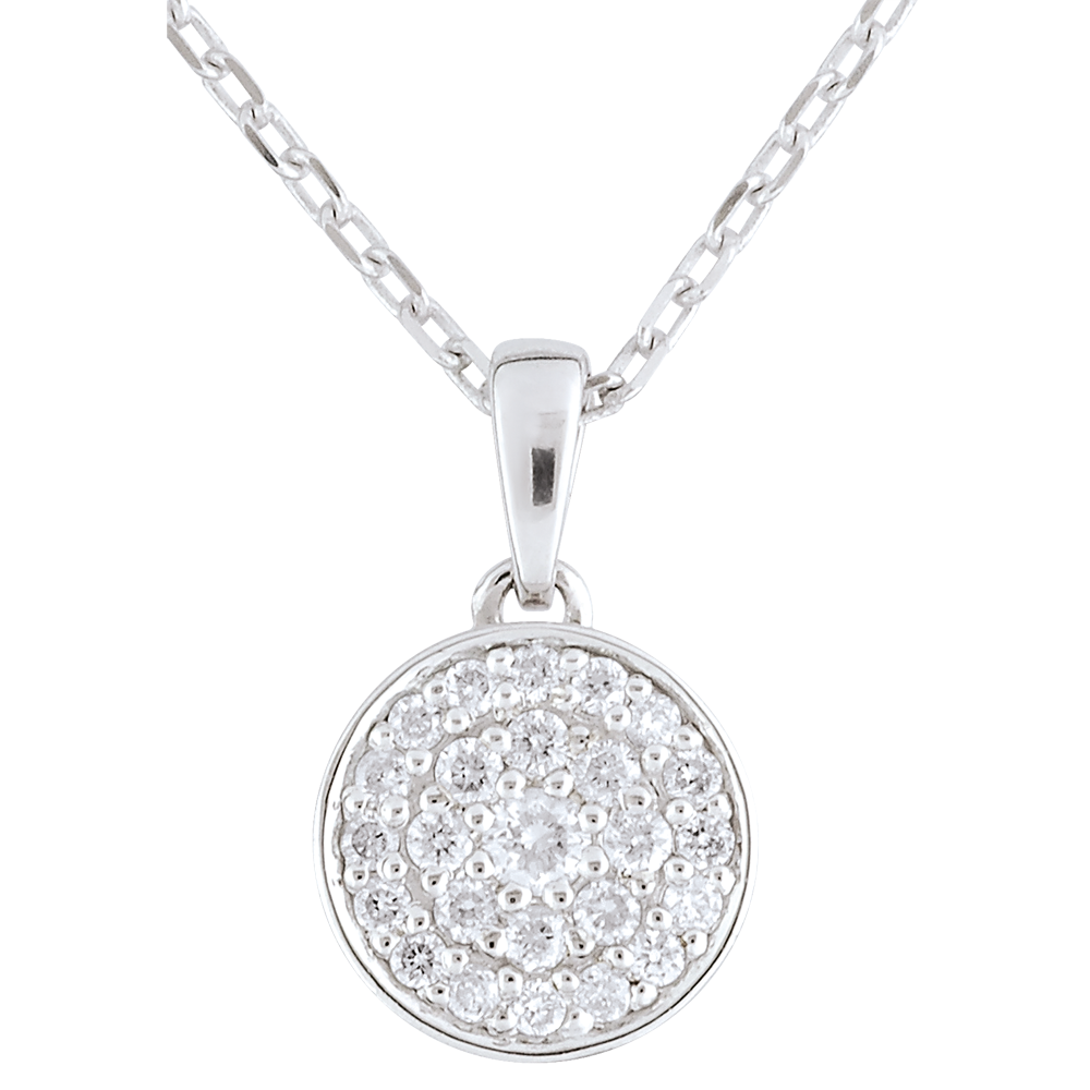 Eine Konstellation von Diamanten, geballt an einem Anhänger, der in vollem Glanze funkelt. Mit Kette von 42cm Länge mit 3cm Verlängerung. Mit Goldkette 375/-. Mit Kette 42 cm + Verlängerung von 3 cm; 375/-. 25 Diamanten : 0.16 Karat - Weißgold (375/-): 1.9 g. Pavé aus natürlichen Diamanten : 25 - Total: 0.163 Karat Weitere Abmessungen