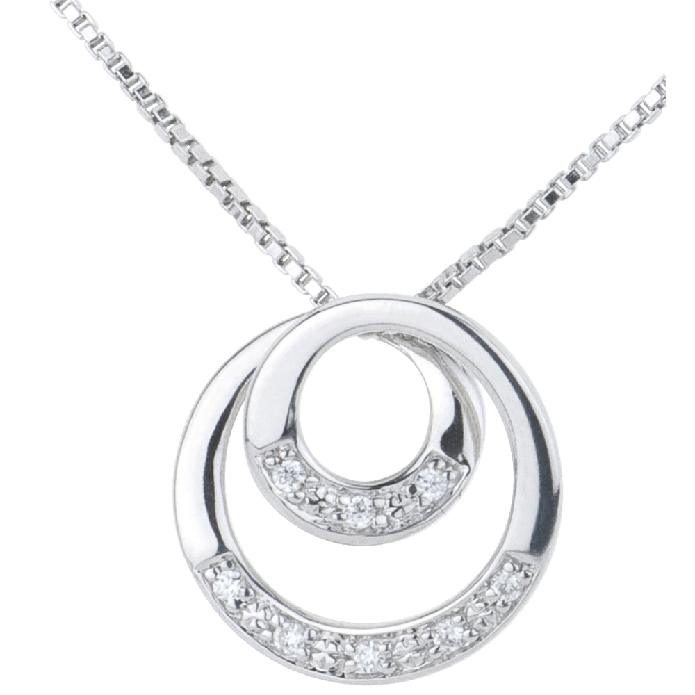 Ein mit Diamanten besetzter Wirbel aus Weißgold, der sich scheinbar endlos auf einer Weißgold Kette zu drehen scheint . Mit verstellbarer Goldkette in 18 Karat - 42 cm und 45 cm. Mit Kette 42 cm + Verlängerung von 3 cm; 750/-. 8 Diamanten : 0.03 Karat - Weißgold (750/-): 2.3 g. Weitere Abmessungen