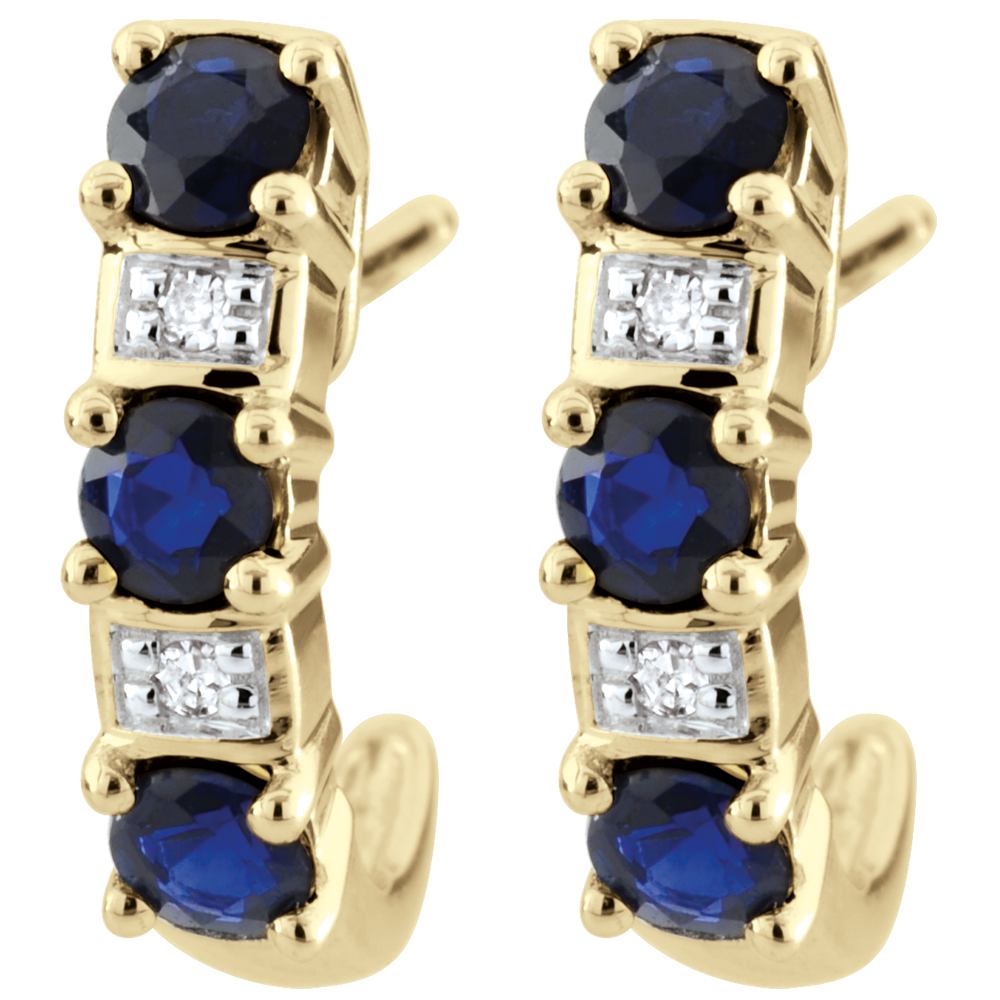 Klassische und zeitlose Halbcreolen, vermischen Gold mit Diamanten und wertvollen Saphiren.