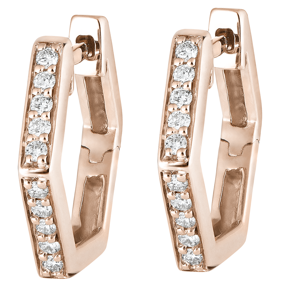 Sechseckige Creolen aus Roségold, besetzt mit zarten Diamanten, die für grafische und gleichzeitig moderne Effekte sorgen. Ein Schmuckstück mit starker Persönlichkeit.