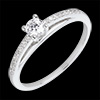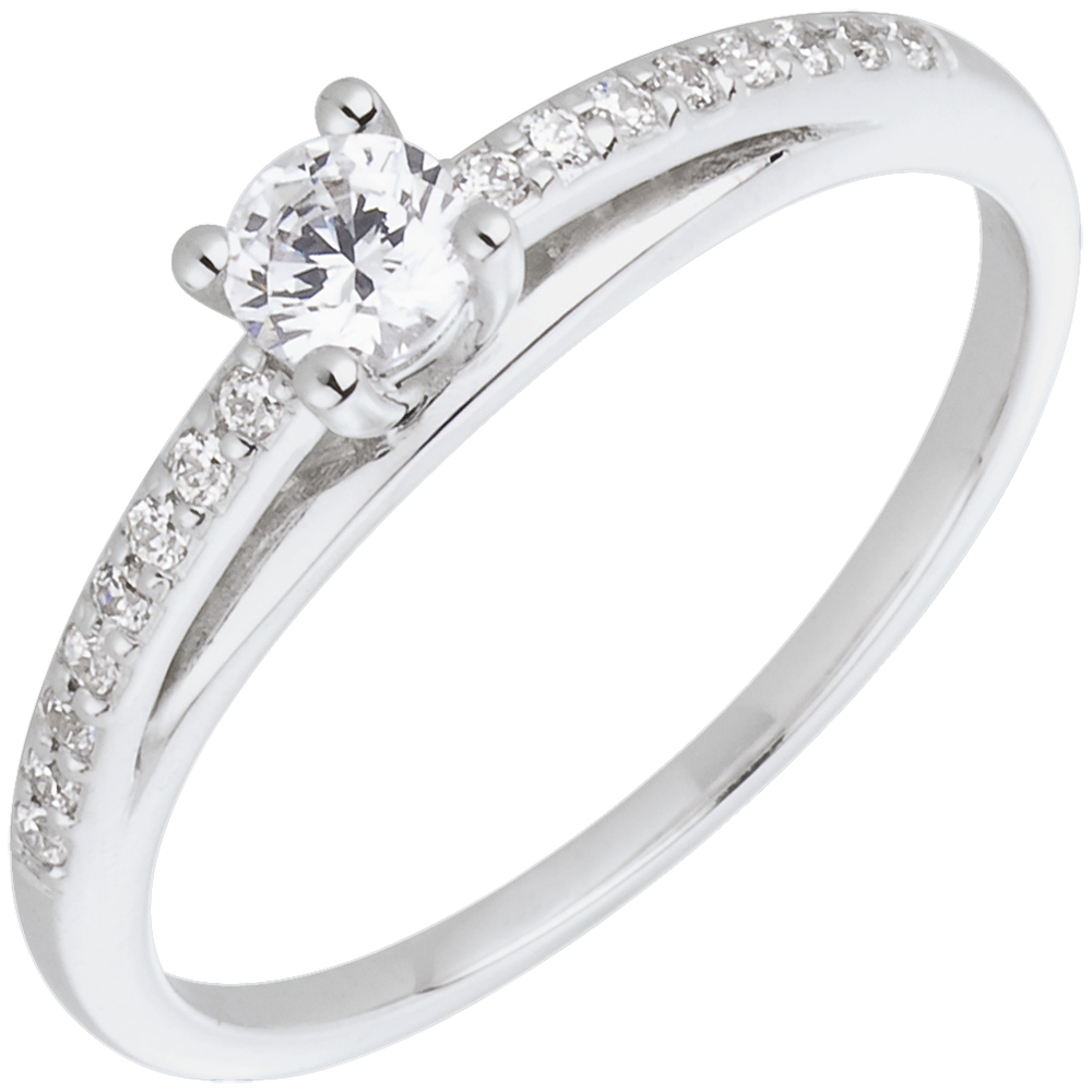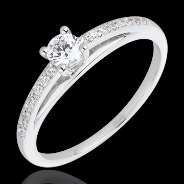Ein Solitärdiamant stellt sich in Begleitung von einer Vielzahl kleiner Brillanten vor, welche auf einer weißgoldenen Fassung um die Wette strahlen. 17 Diamanten : 0.31 Karat - Weißgold (750/-): 2.4 g. Weitere Abmessungen