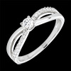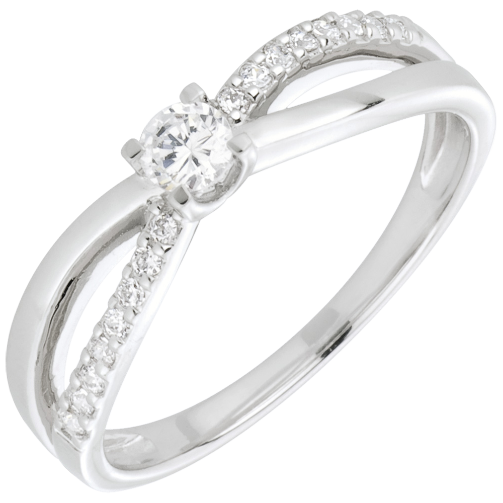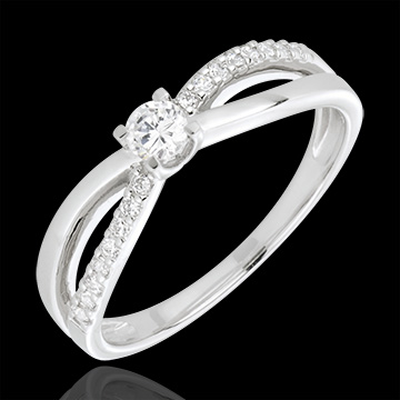 Ein Solitär, gehalten von einem zweigeteilten Ring aus Weißgold und mit Diamanten besetztem Weißgold. 19 Diamanten : 0.26 Karat - Weißgold (750/-): 2.6 g. Weitere Abmessungen