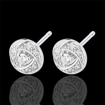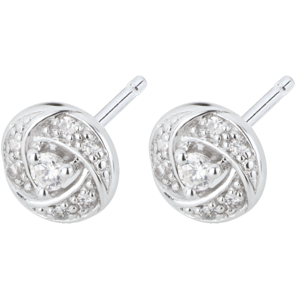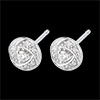 Diese Ohrstecker präsentieren sich jeweils mit einem Solitärdiamanten, der, von einem edlen Diamantpavé begleitet, auf einer eleganten Schärpe aus Weißgold ruht.