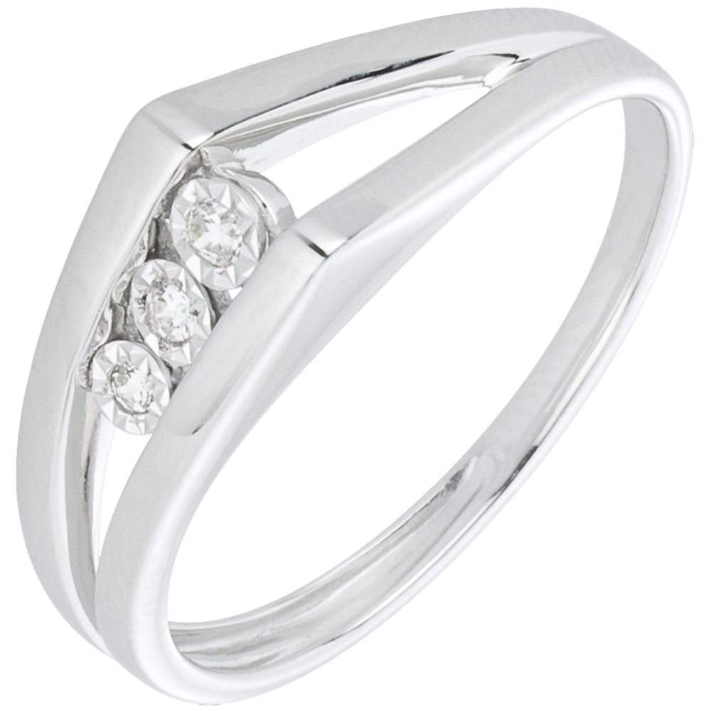 Drei Diamanten, gehalten von einem zweiteligen Ring aus Weißgold, modern und romantisch zugleich. 3 Diamanten : 0.05 Karat - Weißgold (750/-): 2.4 g. Weitere Abmessungen