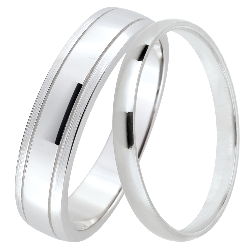 Ein elegantes Trauringpaar für Sie & Ihn. Für Sie ein schmaler, polierter 2 mm-Ring, für Ihn ein mattiertes Weißgold-Band mit glänzendem, horizontalem Akzent.