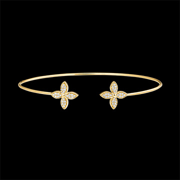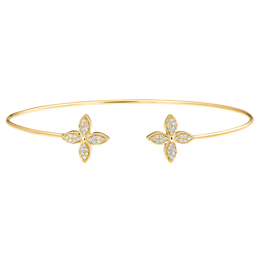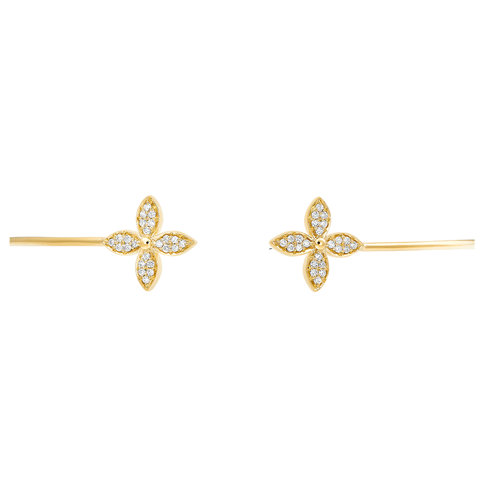 Ein eleganter Armreif aus Gelbgold mit einem Verschluss aus zwei Kleeblättern, die mit funkelnden Diamanten besetzt sind. Ein zarter Glücksbringer in frischer Blüte. 48 Diamanten : 0.17 Karat - Gelbgold (750/-): 5.8 g. Weitere Abmessungen