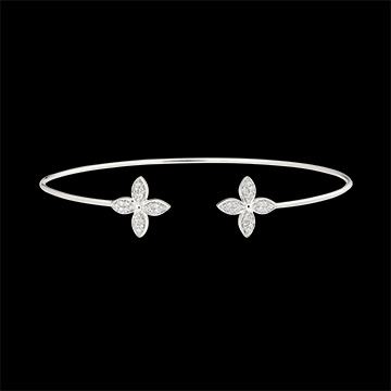 Ein eleganter Armreif aus Weißgold mit einem Verschluss aus zwei Kleeblättern, die mit funkelnden Diamanten besetzt sind. Ein zarter Glücksbringer in frischer Blüte. 48 Diamanten : 0.17 Karat - Weißgold (375/-): 4 g. Weitere Abmessungen