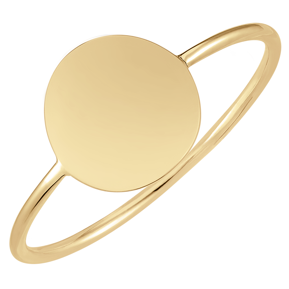 Entdecken Sie diesen schmalen Ring aus 9 Karat Gelbgold, der mit einem runden Medaillon zum Gravieren personalisiert werden kann.