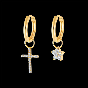 Eine einzelne Creole, die ein Kreuz-Charm aus Gelbgold und ein funkelndes Diamanten-Pavé ziert. Durchmesser des Charm-Rings: 3,1 mm.
