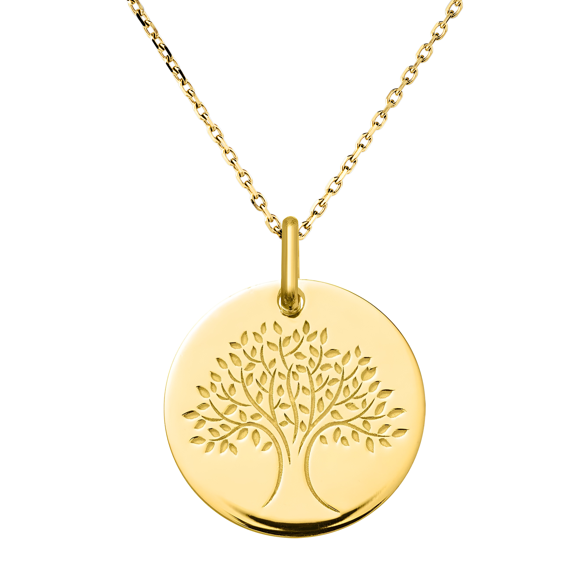 Diese Medaille aus 18-karätigem Gelbgold zeigt einen fein gravierten Lebensbaum mit symmetrisch ausgebreiteten Wurzeln und Ästen, der Wachstum, Balance und die Verbindung von Vergangenheit und Zukunft symbolisiert.
