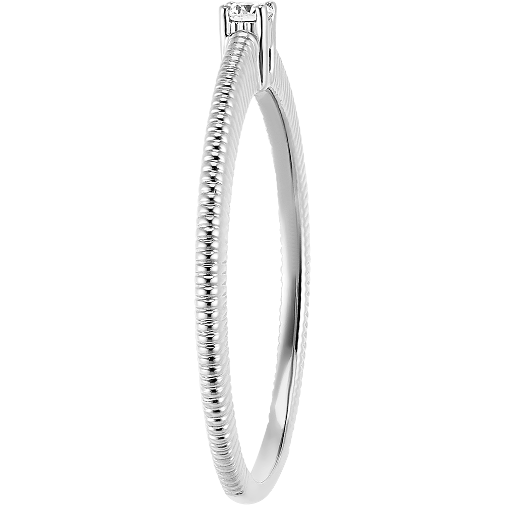 Ein Solitärdiamant, der von 4 Krappen gehalten wird und auf einem kostbaren, bearbeiteten Goldring sitzt. Ein origineller und zeitloser Verlobungsring. 1 Diamant : 0.04 Karat - Weißgold (375/-): 1.2 g. Weitere Abmessungen