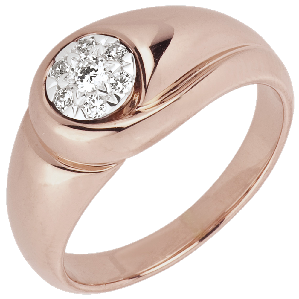 Das Zusammenspiel sinnlicher Kurven, repräsentiert die höhste Vollkommenheit erreicht - der Aufstieg der Liebe ins Paradies. Dieser Ring wurde von Morgan H., von der Modeschule ESMOD, entworfen. 7 Diamanten : 0.14 Karat - Rotgold (750/-): 4.7 g. Weitere Abmessungen