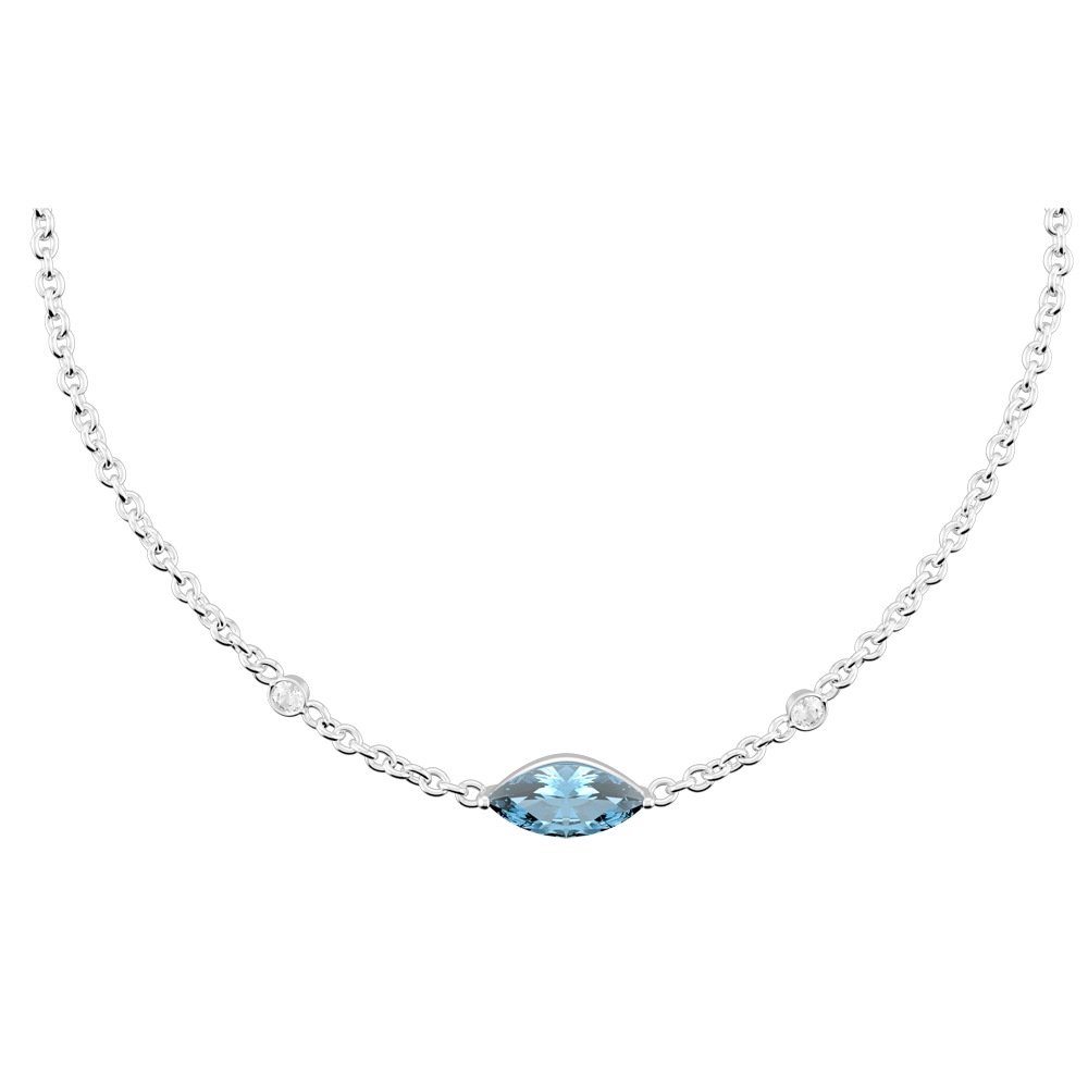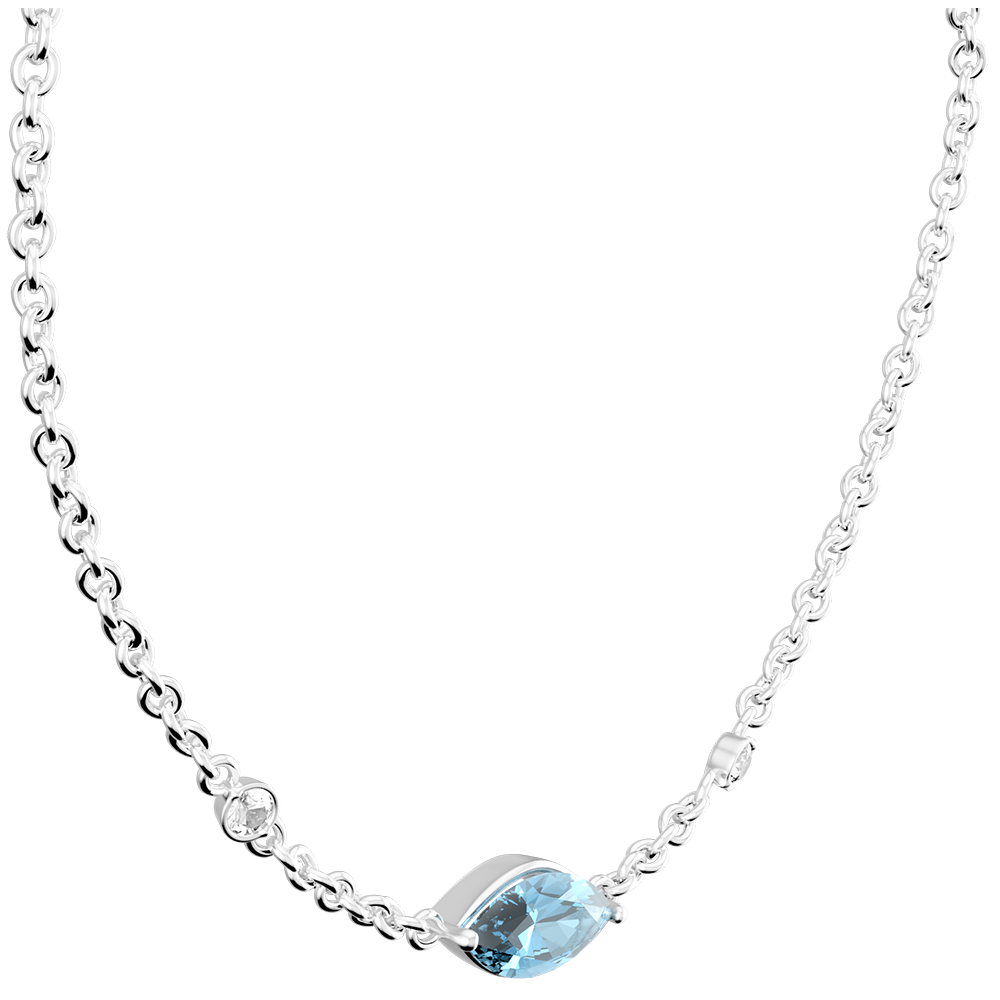 Der kostbare Augapfel, welcher durch einen blauen Topas verkörpert wird, thront in der Mitte dieser zarten Kette in Weißgold. Er wird von zwei edlen Diamanten umgeben, die beinahe wie zwei Tränen in der Ewigkeit festgehalten sind.