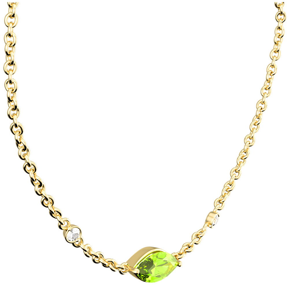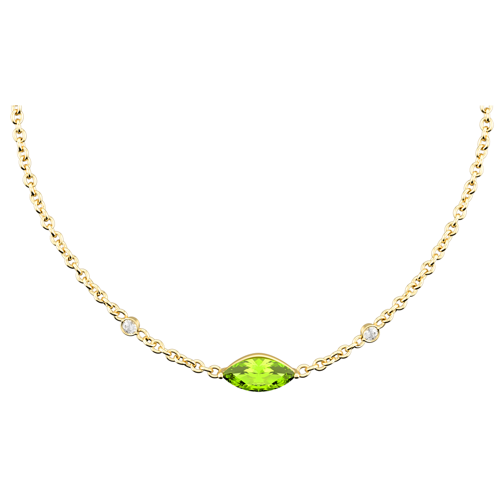 Der kostbare Augapfel, welcher durch einen Peridot verkörpert wird, thront in der Mitte dieser zarten Kette in Gelbgold. Er wird von zwei edlen Diamanten umgeben, die beinahe wie zwei Tränen in der Ewigkeit festgehalten sind.