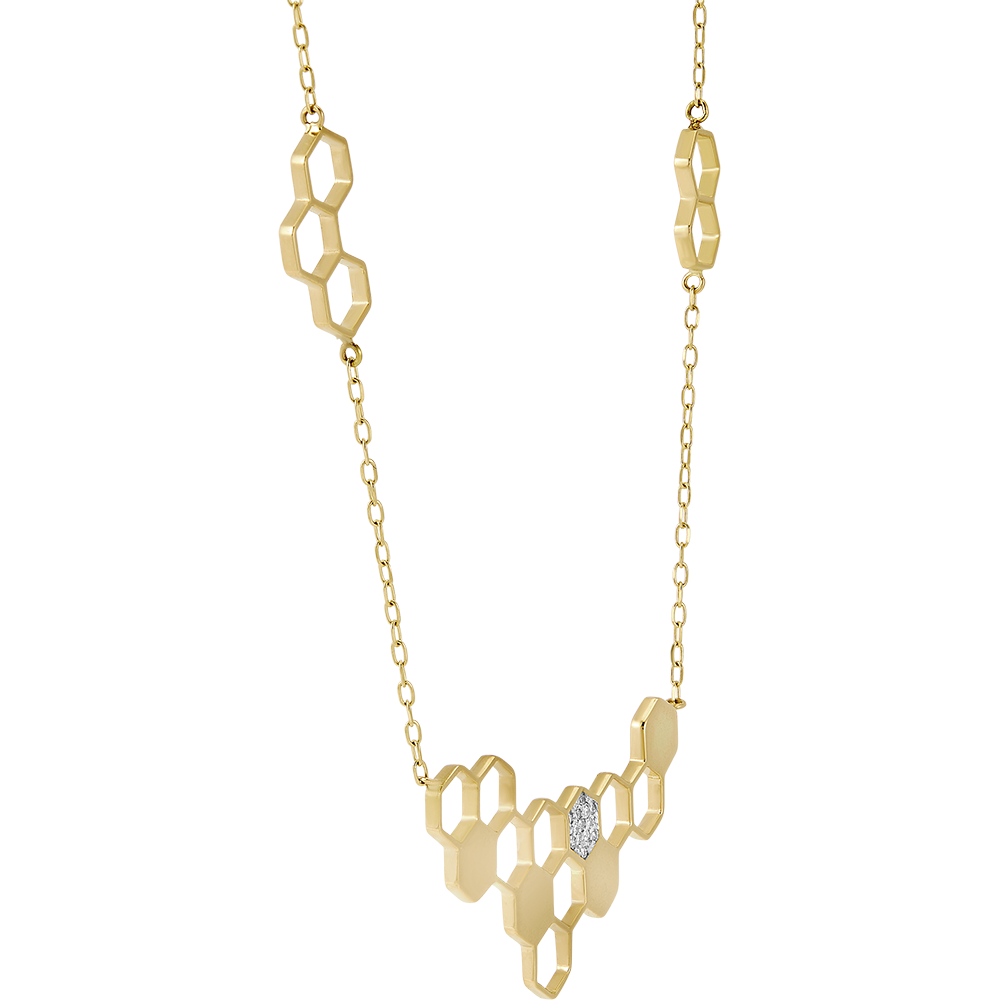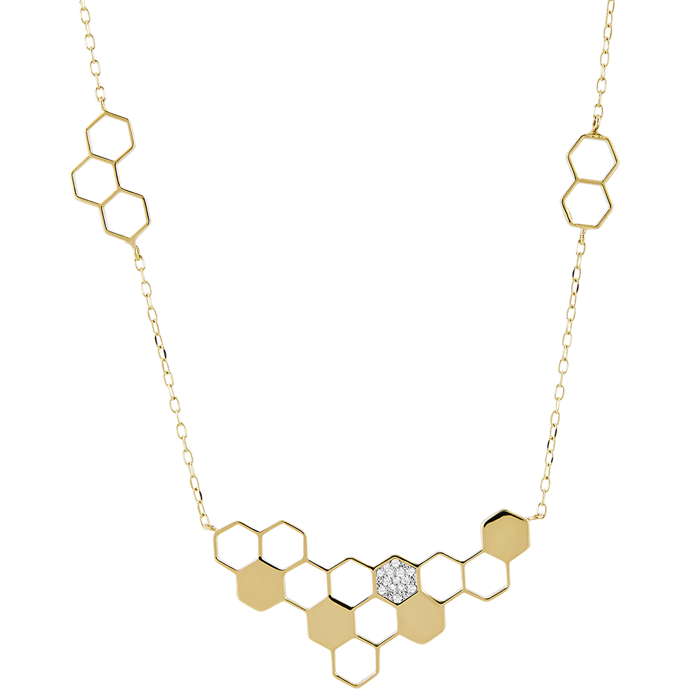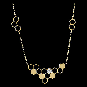 Die zarte Kette ist ebenfalls mit mehreren Goldwaben verziert und sorgt für ein harmonisches Gesamtbild.