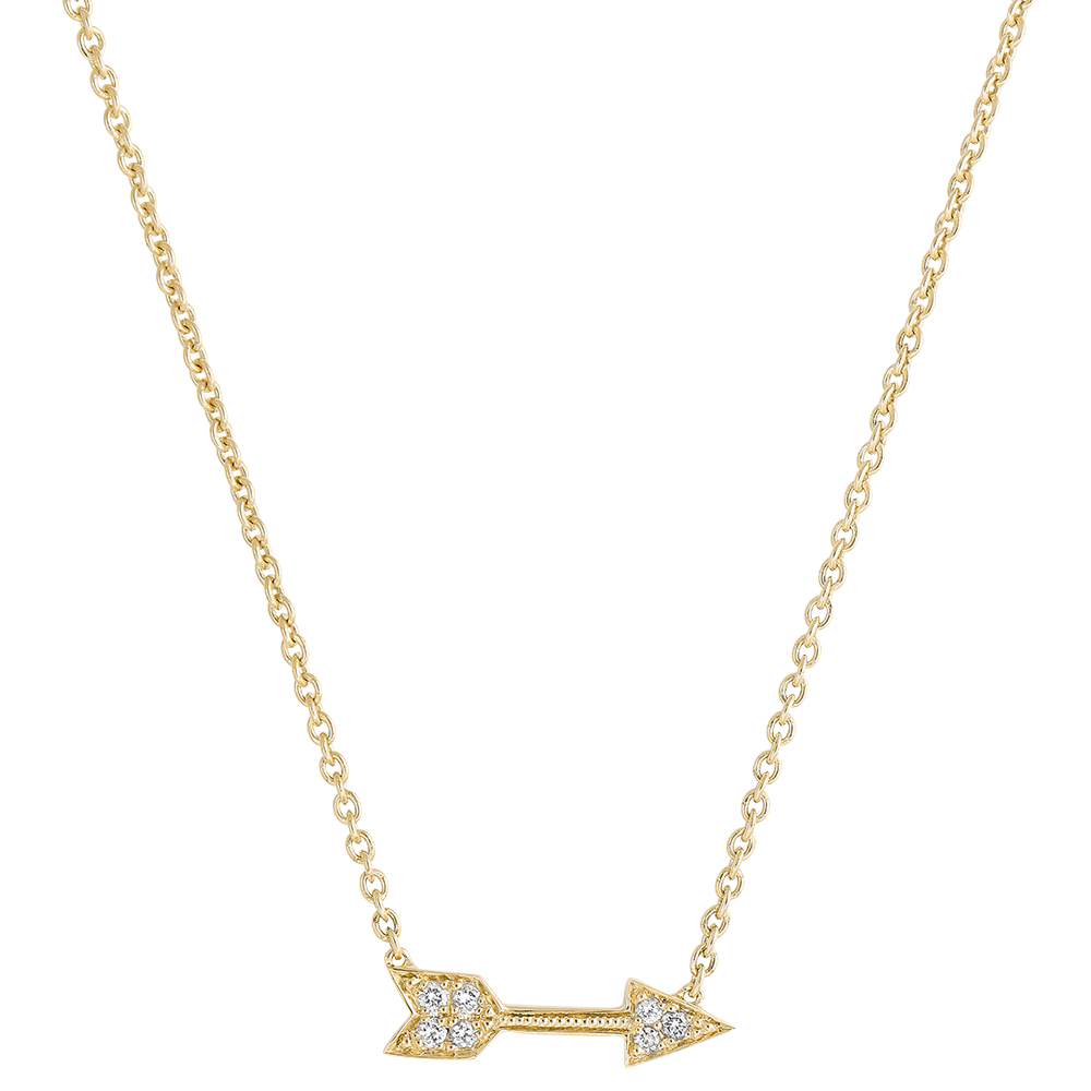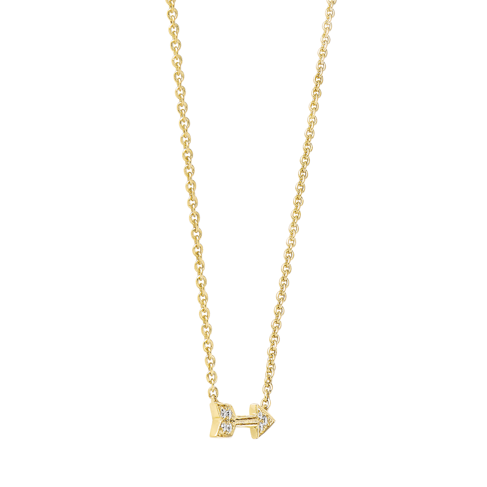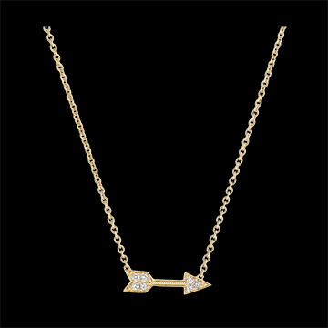 Eine Pfeil-Halskette aus Gelbgold mit Diamanten-Pavé, die gleichzeitig eine romantische Seele und einen Rock-Stil symbolisiert. Mit Kette und zwei einstellbaren Längen: 42cm und 45cm. Mit Kette 42 cm + Verlängerung von 3 cm; 375/-. 7 Diamanten : 0.06 Karat - Gelbgold (375/-): 2.2 g. Weitere Abmessungen