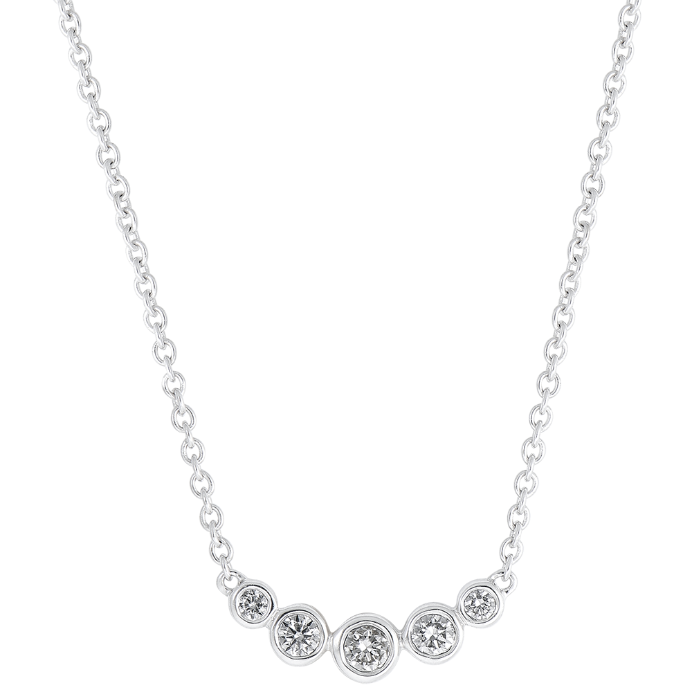 Halskette aus Weißgold mit aneinandergereihten, geschlossen eingefassten Diamanten-Pavés.Ein unvergleichliches Funkeln, inspiriert durch das zarte Licht, das sich im Morgentau spiegelt. Kettenlänge 45cm, Einstellring bei 42cm. Mit Kette 42 cm + Verlängerung von 3 cm; 750/-. 5 Diamanten : 0.19 Karat - Weißgold (750/-): 2.8 g. Weitere Abmessungen