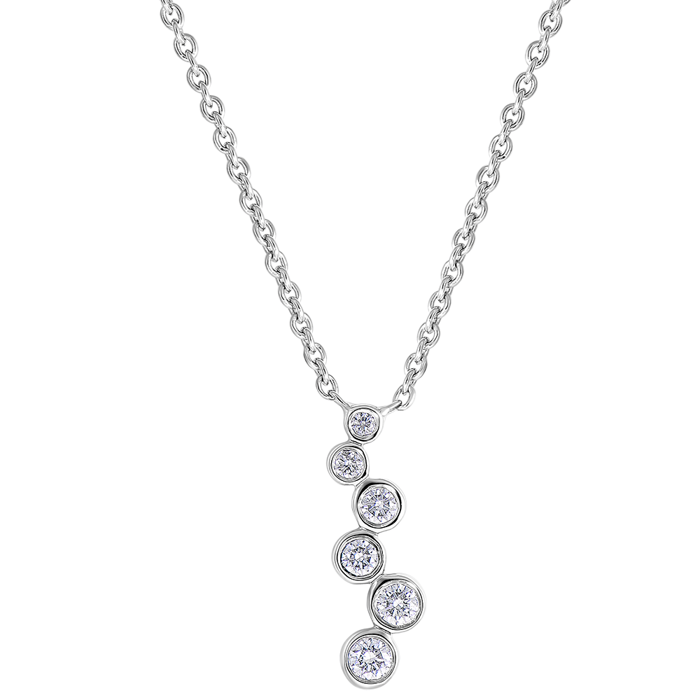 Eine zarte, raffinierte Halskette mit 6 Diamanten in geschlossener Fassung, die sich wie Tauperlen aneinanderreihen. Kettenlänge 45cm, Einstellring bei 42cm. Mit Kette 42 cm + Verlängerung von 3 cm; 375/-. 6 Diamanten : 0.14 Karat - Weißgold (375/-): 2.4 g. Weitere Abmessungen