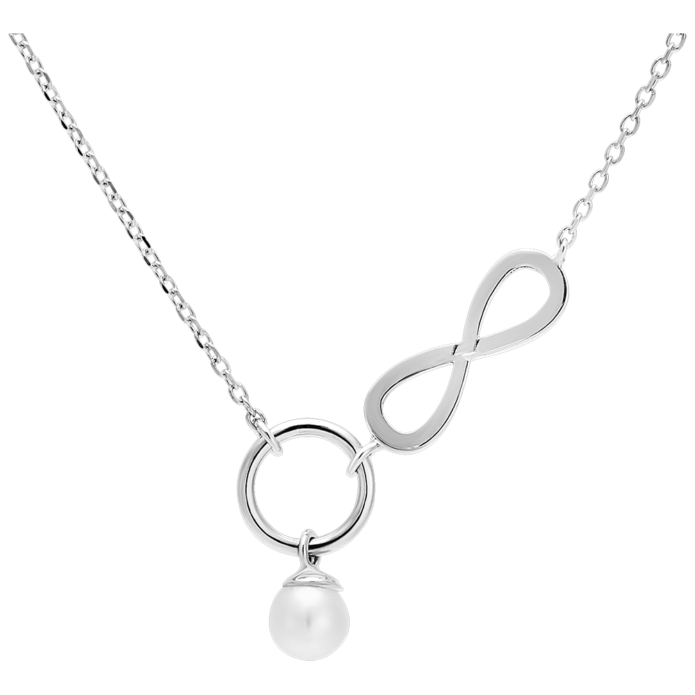 Eine Halskette aus Weißgold, verziert mit einem Ring, einer Perle und einem Unendlichkeitsanhänger, für ein Modell voller Bewegung und Leichtigkeit. Mit Kette 42 cm + Verlängerung von 3 cm; 750/-. Weißgold (750/-): 1.6 g. Weisse Perle : 1 - Weitere Abmessungen