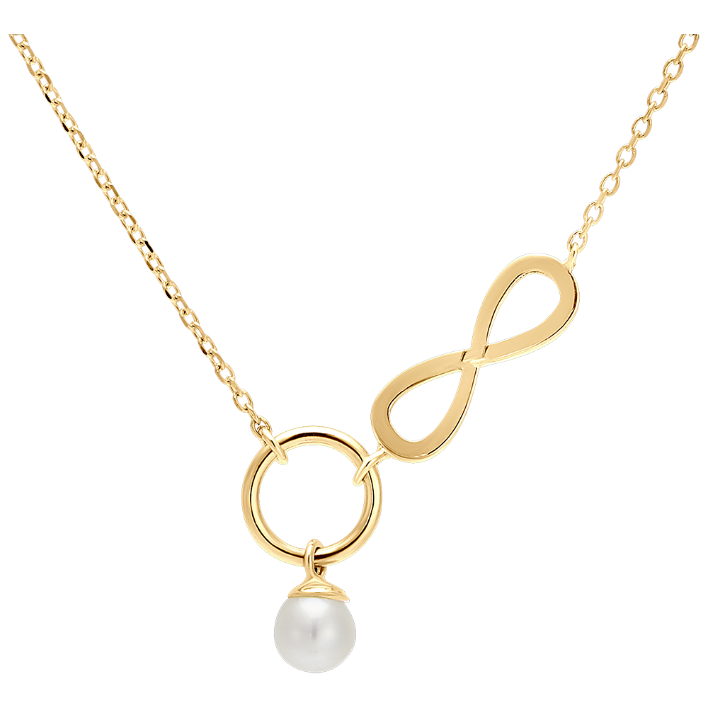 Eine Halskette aus Gelbgold, verziert mit einem Ring, einer Perle und einem Unendlichkeitsanhänger, für ein Modell voller Bewegung und Leichtigkeit. Mit Kette 42 cm + Verlängerung von 3 cm; 375/-. Gelbgold (375/-): 1.3 g. Weisse Perle : 1 - Weitere Abmessungen