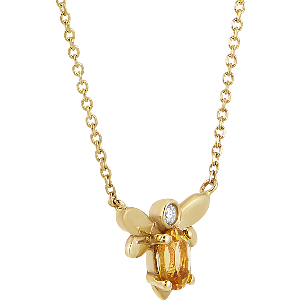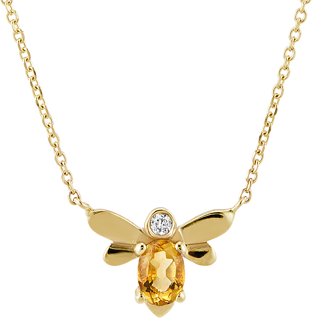 Die Halskette Pop-Biene aus Gelbgold stellt die Bienenkönigin dar. Die dünne Gelbgoldkette hält zart eine Biene, deren Körper aus einem 4 x 3 mm großen ovalen Citrin und einem Labordiamanten besteht.