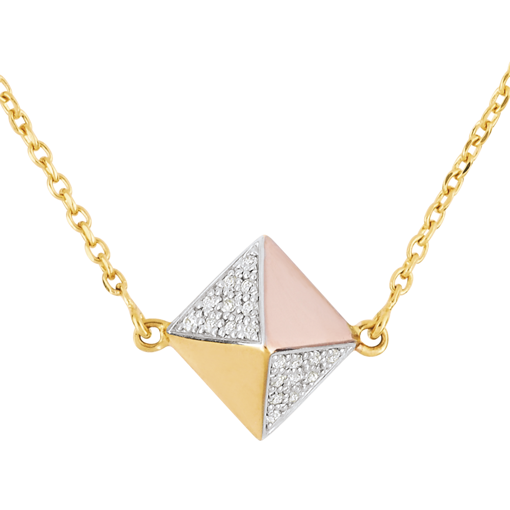 Die achteckige Form eines Rohdiamanten findet sich im Anhänger dieser edlen Halskette wieder. Mit einem eindrucksvollen Diamantpavé besetzt, würdigt dieses Schmuckstück ursprüngliche und natürliche Formen. Mit Kette 42 cm + Verlängerung von 3 cm; 375/-. 20 Diamanten : 0.08 Karat - Tricolor (375/-): 2.8 g. Weitere Abmessungen