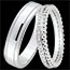 Ein diamantbesetzter Ring in Weißgold vereint mit einem Ring aus weißgoldenen Perlen bilden ein anmutiges Duo. Ein Trauring mit weiblicher Note, klassisch und originell zugleich.