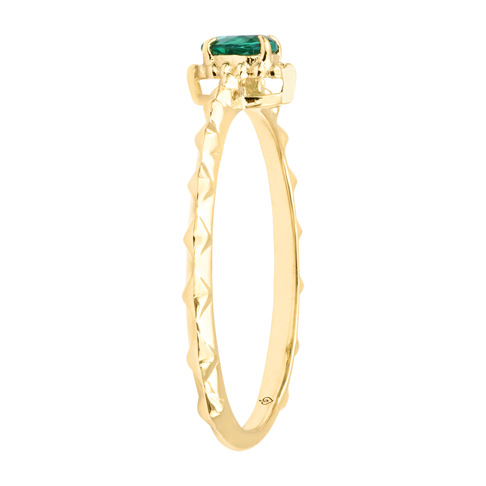 Ein 0,3-Karat-Smaragd erstrahlt auf einem Ring mit pyramidenförmig geschliffenen Facetten, die das Licht bei jeder Bewegung einfangen.Ein mutiges und wertvolles Schmuckstück – wie ein Versprechen von Charakter in Ihrer Hand.