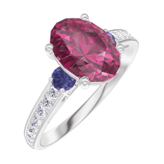 « L'ATELIER » NR. 168168Ring Weißgold 375/-(9Kt) - Rubin Oval 1 Karat - Seitliche Steine Blauer Saphir - Fassung Diamant 4.7 (10)
