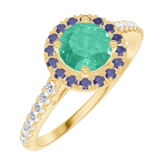 « L'ATELIER » NR. 170902Ring Gelbgold 375/-(9Kt) - Smaragd rund 0.5 Karat - Halo Blauer Saphir - Fassung Diamant 4.7 (18)
