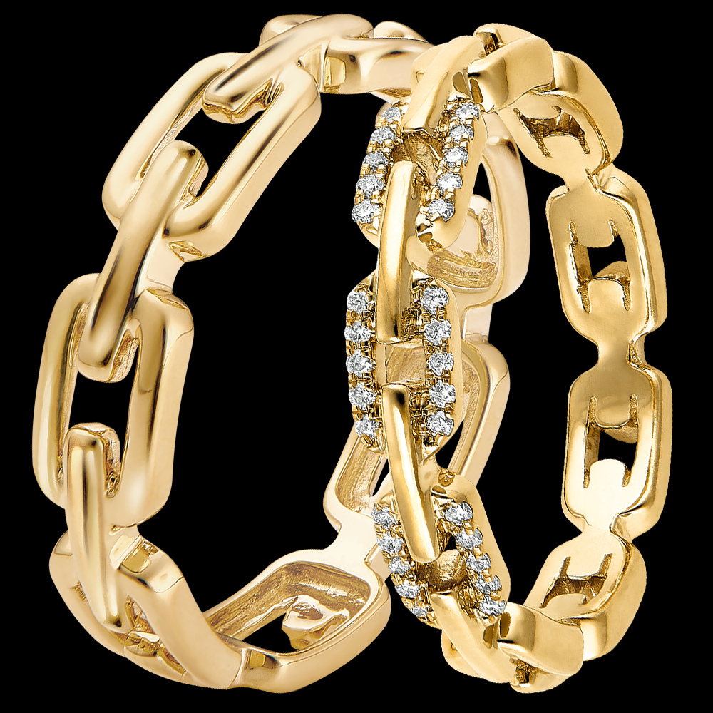 Ein elegantes Paar Eheringe aus Gelbgold, inspiriert vom klassischen Maillon Cubain Design und veredelt mit funkelnden Diamanten.