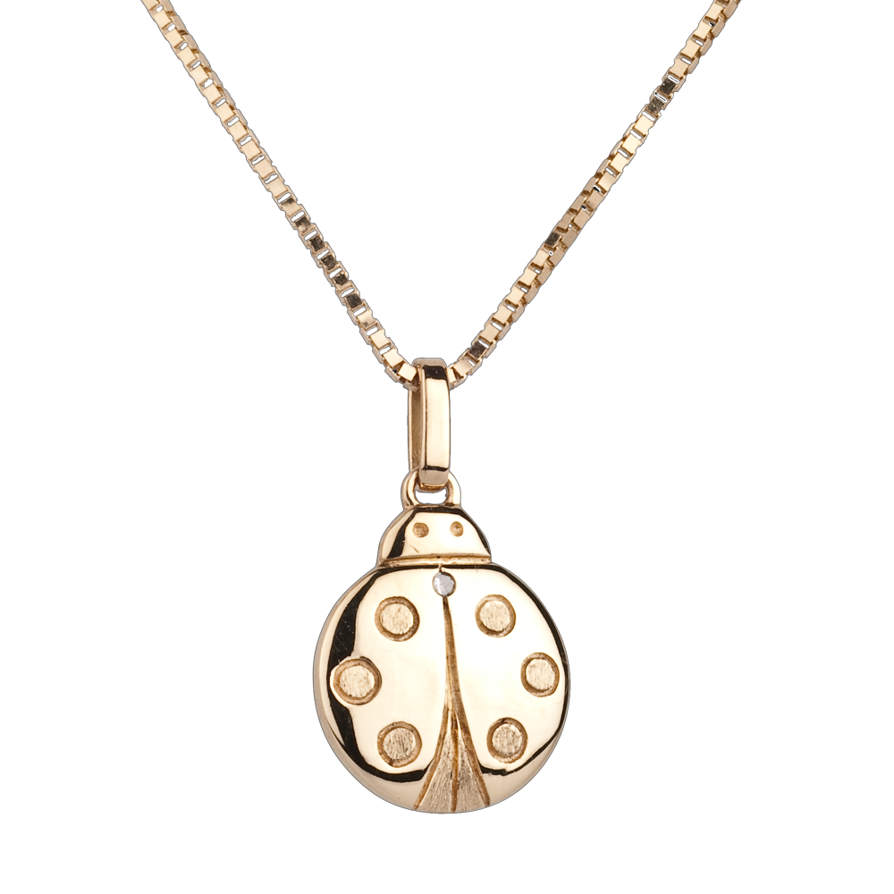Der siebte Punkt des Marienkäfers ist mit einem weißen Diamanten von 0,05 Karat besetzt, der dem Schmuckstück einen feinen Glanz verleiht.