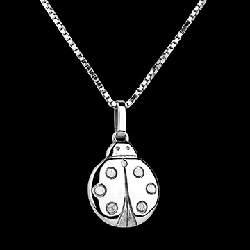 Ein weißgoldener Marienkäfer mit runden und zarten Formen ist ein echter Glücksbringer. Sein siebter Punkt ist ein kleiner Diamant. Großes Modell. Ohne Kette. 1 Diamant : 0.05 Karat - Weißgold (375/-): 0.9 g. Weitere Abmessungen
