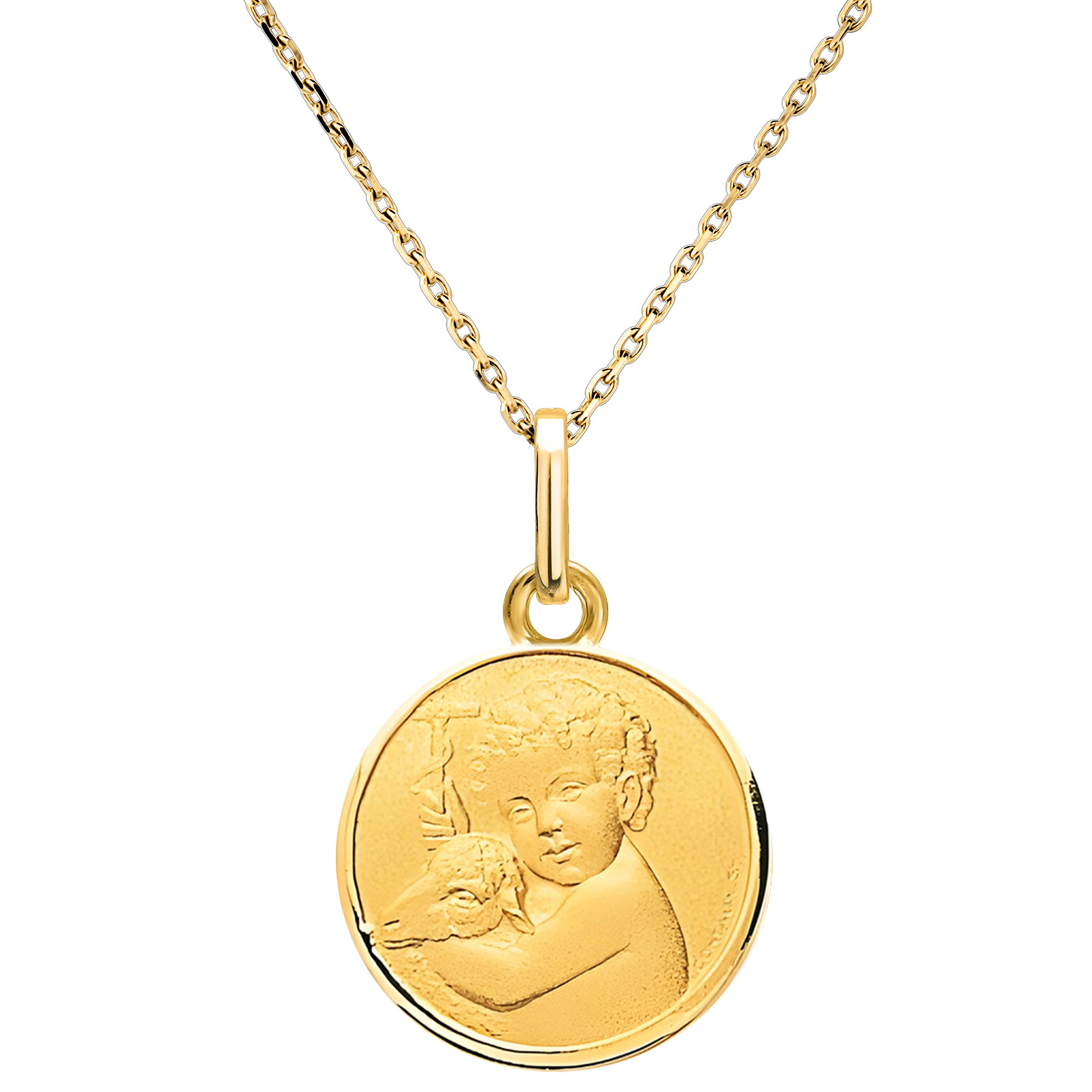 Diese Medaille aus 18-karätigem Gelbgold zeigt ein Kind, das liebevoll ein Lamm umarmt, ein Symbol für Reinheit, Sanftheit und göttlichen Schutz. Ideal für eine Taufe oder Geburt, verkörpert dieses Schmuckstück bedingungslose Liebe und himmlischen Segen, der das Kind auf seinem spirituellen Weg begleitet.