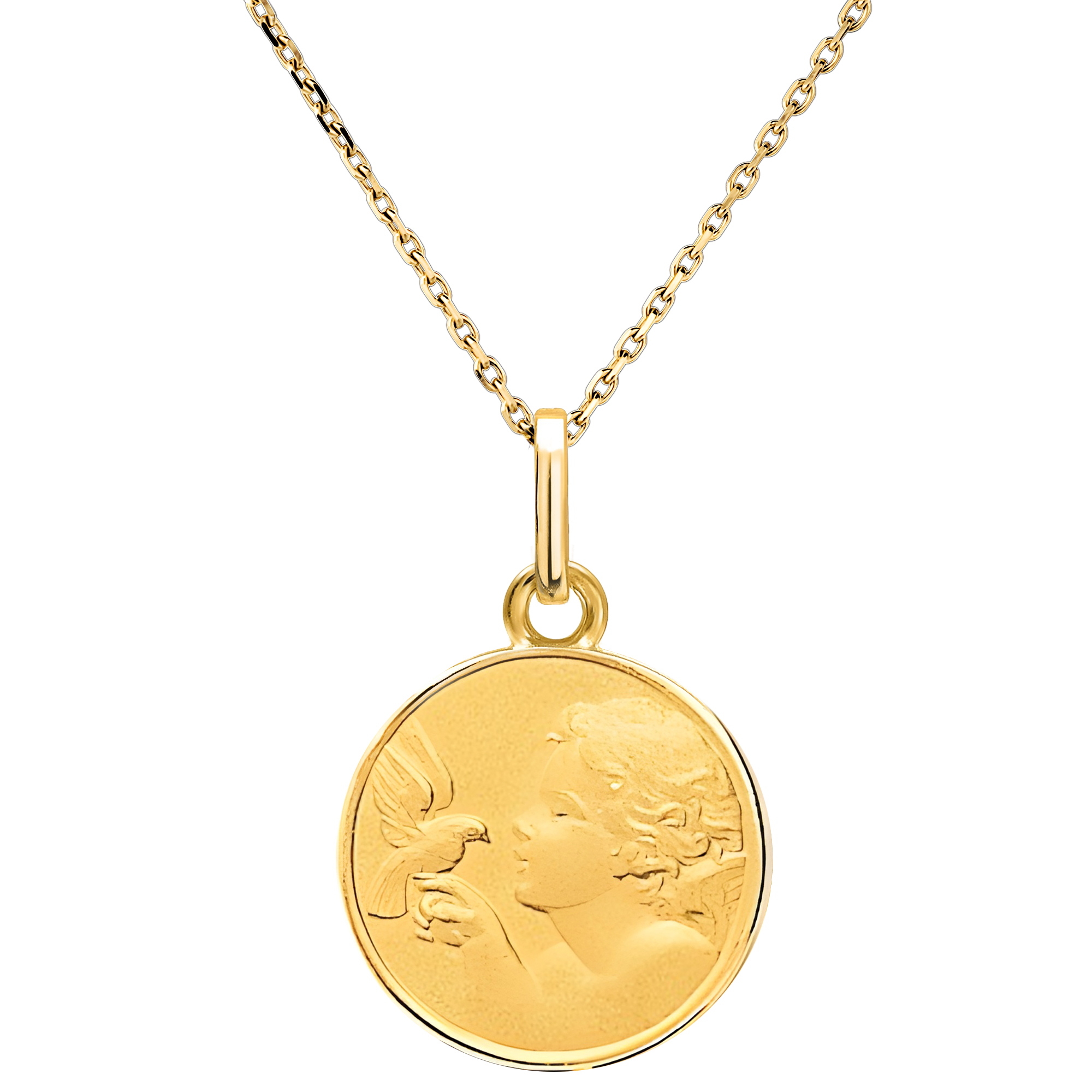 Diese Medaille aus Gelbgold zeigt ein Kind, das sanft eine Taube betrachtet, die auf seinem Finger sitzt. Sie symbolisiert Unschuld, Frieden und Harmonie und ist ideal, um eine Taufe oder Geburt zu feiern, indem sie die Reinheit und Gelassenheit eines kostbaren Moments verkörpert.