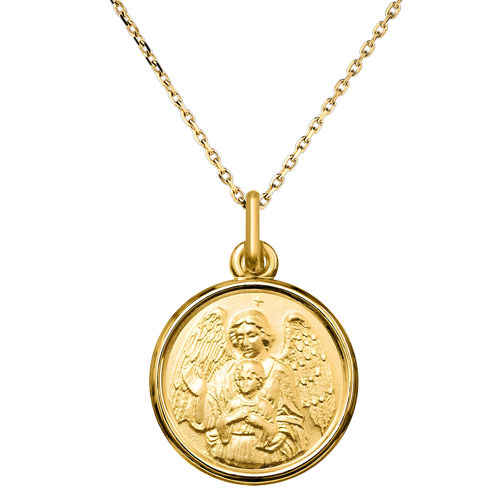 Diese Medaille aus Gelbgold zeigt einen Schutzengel, der liebevoll ein Kind hält und Liebe, Schutz und göttliche Güte symbolisiert. Ein bedeutungsvolles Schmuckstück, ideal für eine Taufe oder eine spirituelle Gelegenheit, das die Sicherheit und Gelassenheit eines Schutzengels hervorruft. Material: 18-karätiges Gelbgold. Durchmesser: 14 mm. Oberfläche: Sandgestrahlte Reliefs mit polierter Goldkante. Individuelle Gravur auf der Rückseite. In einer eleganten Schatulle geliefert, bereit, als Symbol für göttlichen Schutz und bedingungslose Liebe zu schenken. Ohne Kette. Gelbgold (750/-): 1.5 g. Weitere Abmessungen