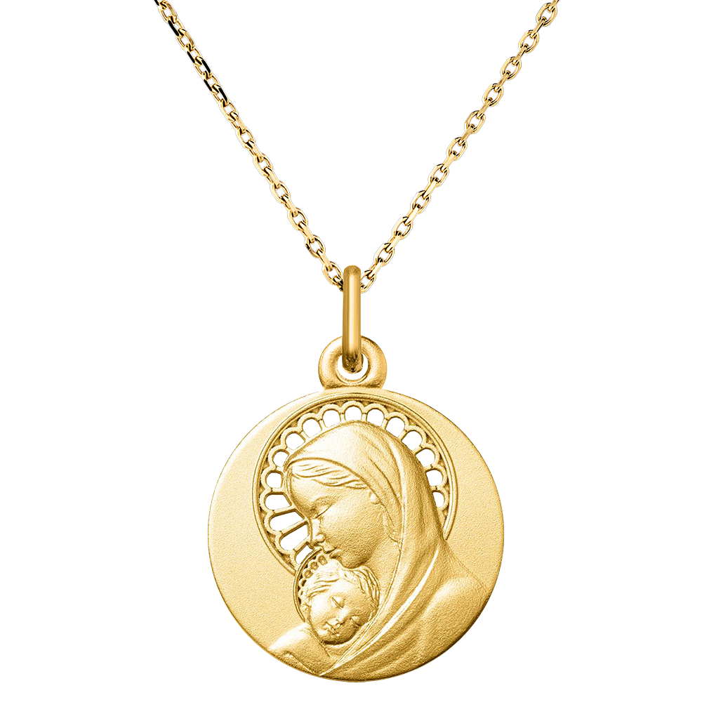 Diese Medaille aus Gelbgold zeigt die zärtliche Verbindung zwischen der Jungfrau Maria und dem Jesuskind. Die Details ihrer Gesichter, umgeben von einem filigran durchbrochenen Heiligenschein, spiegeln göttliche Reinheit und mütterliche Liebe wider. Die Sanftheit des Augenblicks wird durch den subtilen Kontrast zwischen der mattierten Oberfläche und dem Durchbruch-Design hervorgehoben. Ein serenes Schmuckstück, ideal zur Feier heiliger Anlässe wie Taufe oder Kommunion. Material: 9-karätiges Gelbgold (375/1000). Durchmesser: 16 mm. Finish: Sandgestrahltes Relief mit durchbrochenem Heiligenschein. Personalisierbare Gravur auf der Rückseite. Präsentiert in einem eleganten Etui, ideal zur Markierung eines spirituellen Anlasses. Ohne Kette. Gelbgold (375/-): 1.5 g. Weitere Abmessungen