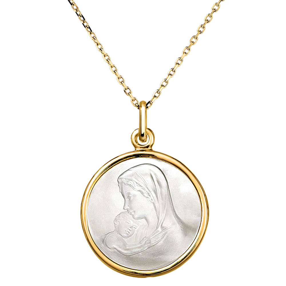 Diese Medaille aus Gelbgold und Perlmutt veranschaulicht die erhabene Zärtlichkeit zwischen der Jungfrau Maria und dem Jesuskind. Die filigrane Reliefdarstellung der Figuren, verstärkt durch den Glanz des Perlmutts, betont die Weichheit und Reinheit des Moments. Diese ruhige, mütterliche Szene symbolisiert bedingungslose Liebe und göttlichen Schutz. Ein kostbares Schmuckstück, ideal zur Feier eines bedeutsamen spirituellen Ereignisses wie Taufe oder Kommunion.