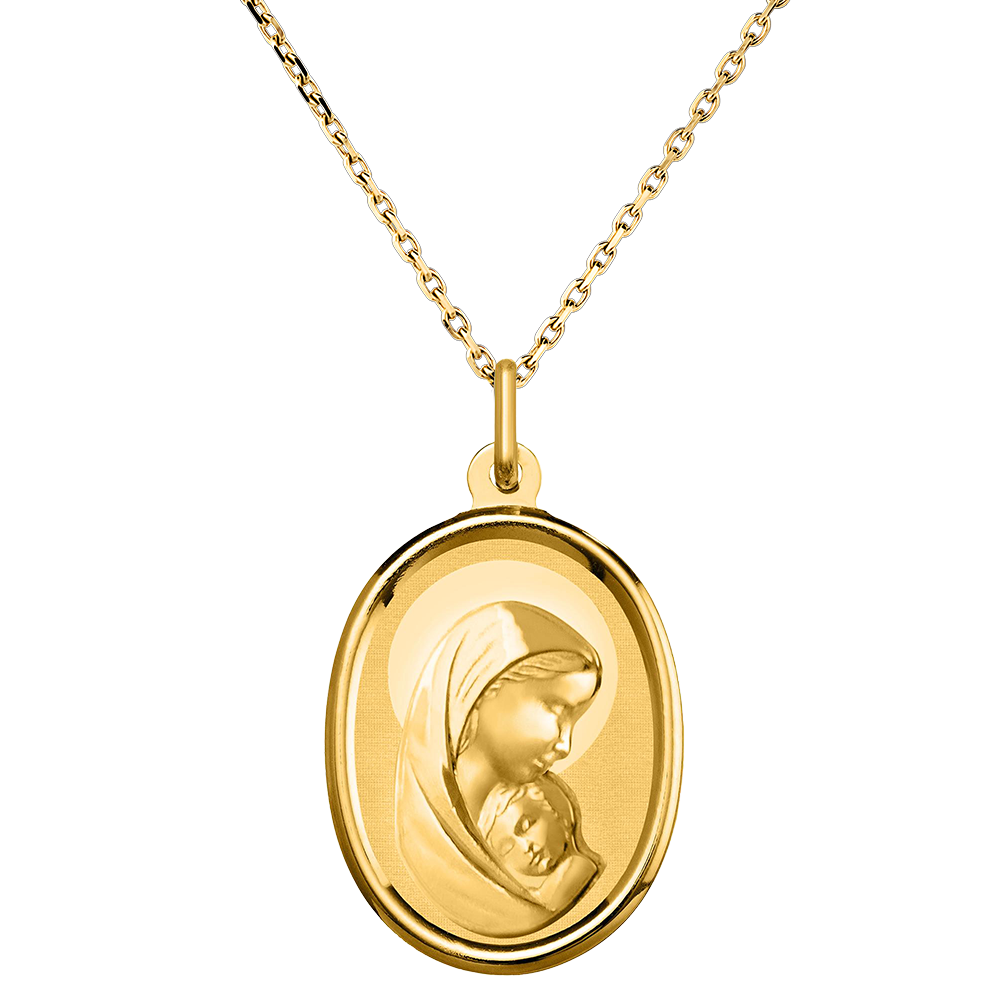 Dieses Medaillon aus Gelbgold fängt einen Moment zärtlicher Liebe ein: die Jungfrau Maria wiegt das Jesuskind in ihren Armen. Die ovale Form betont die Sanftheit dieser mütterlichen Geste, umgeben von einem zarten Heiligenschein, der die Reinheit und die heilige Hingabe symbolisiert, die sie begleitet. Die polierte Oberfläche und die feinen Konturen unterstreichen die Sanftmut und Gelassenheit dieser göttlichen Szene, ideal zur Feier eines spirituellen Moments wie einer Taufe oder Kommunion.