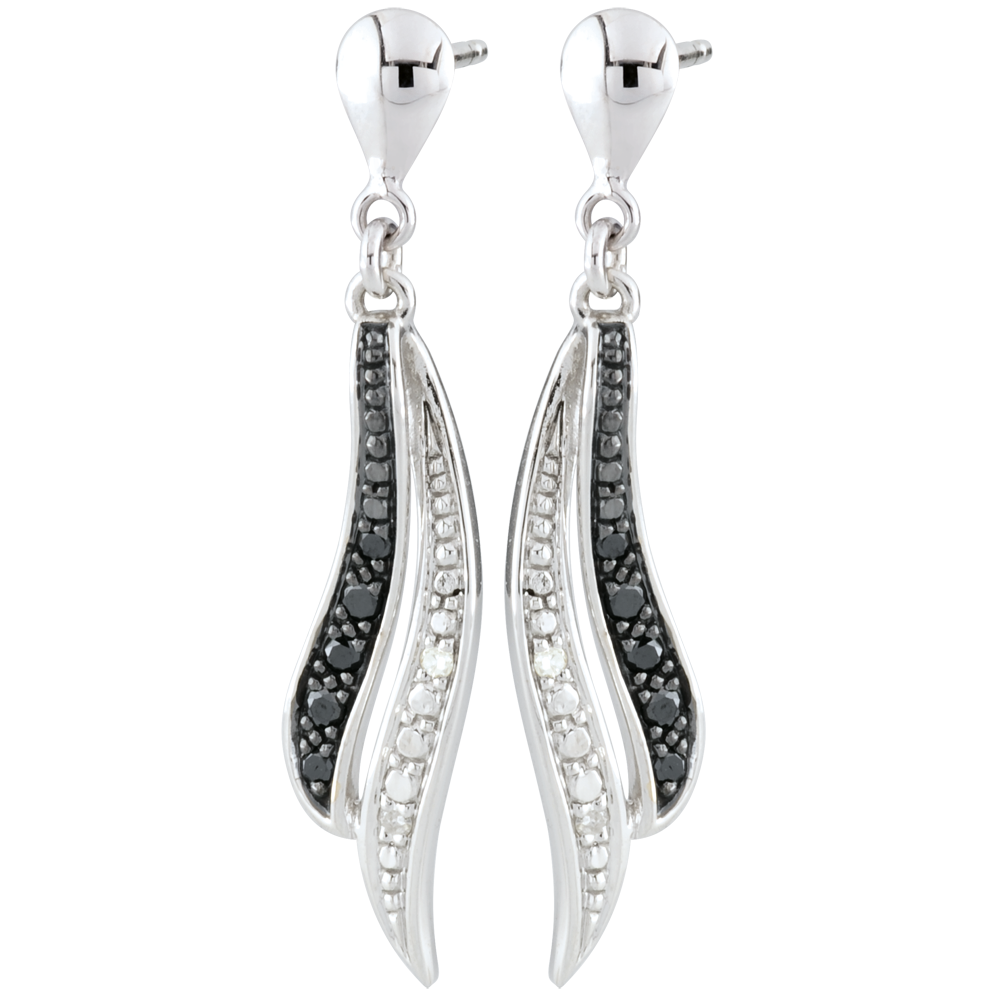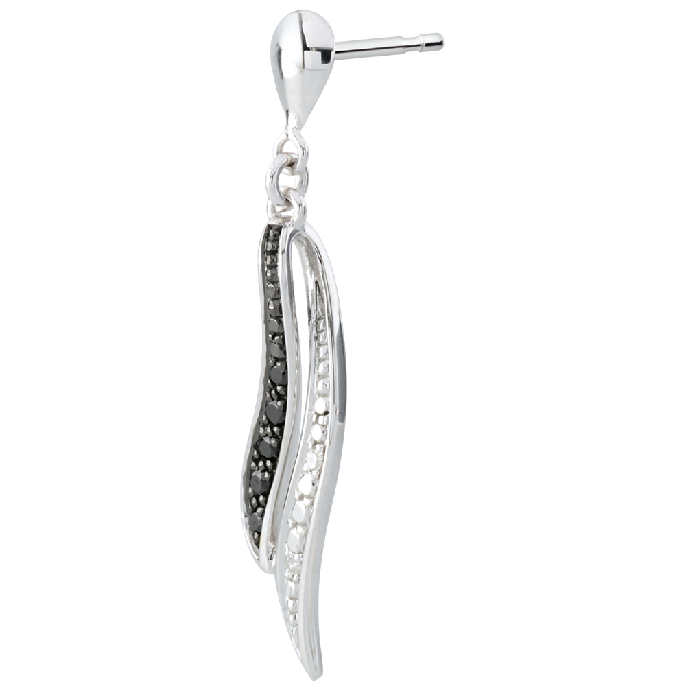 Ein Wellenpaar, welches in einem Hell-Dunkel-Kontrast auf edle Weise Ihr Gesicht erstrahlen lässt<.br>4 Diamanten: 0.016 Karat - Weißgold (9 kt = 375/1000): 1.1 Gramm. 4 Diamanten : 0.02 Karat - Weißgold (375/-): 1.1 g. Schwarzer Diamant : 10 - Total: 0.068 KaratWeitere Abmessungen