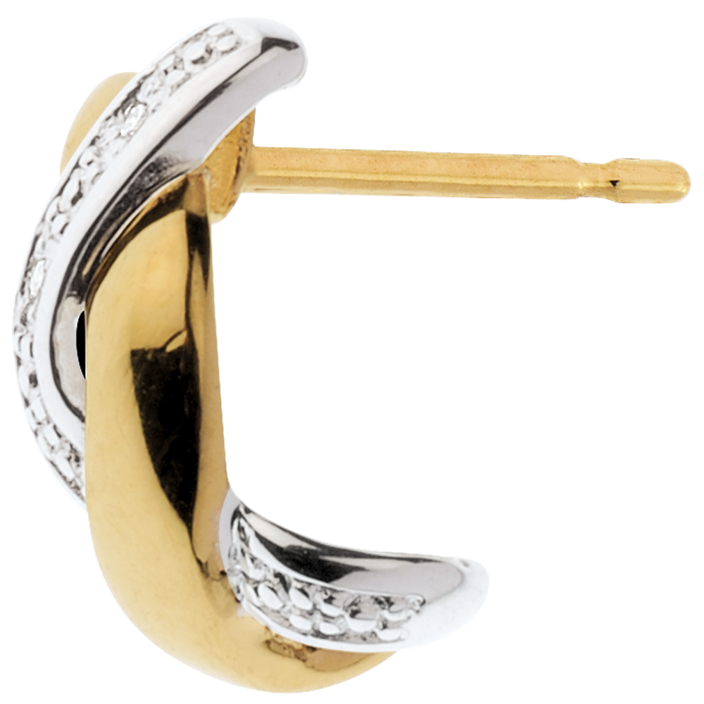 Ein edles Band aus Weissgold mit Diamanten und ein Band aus Gelbgold liegen über Kreuz - ein origineller Ohrschmuck.