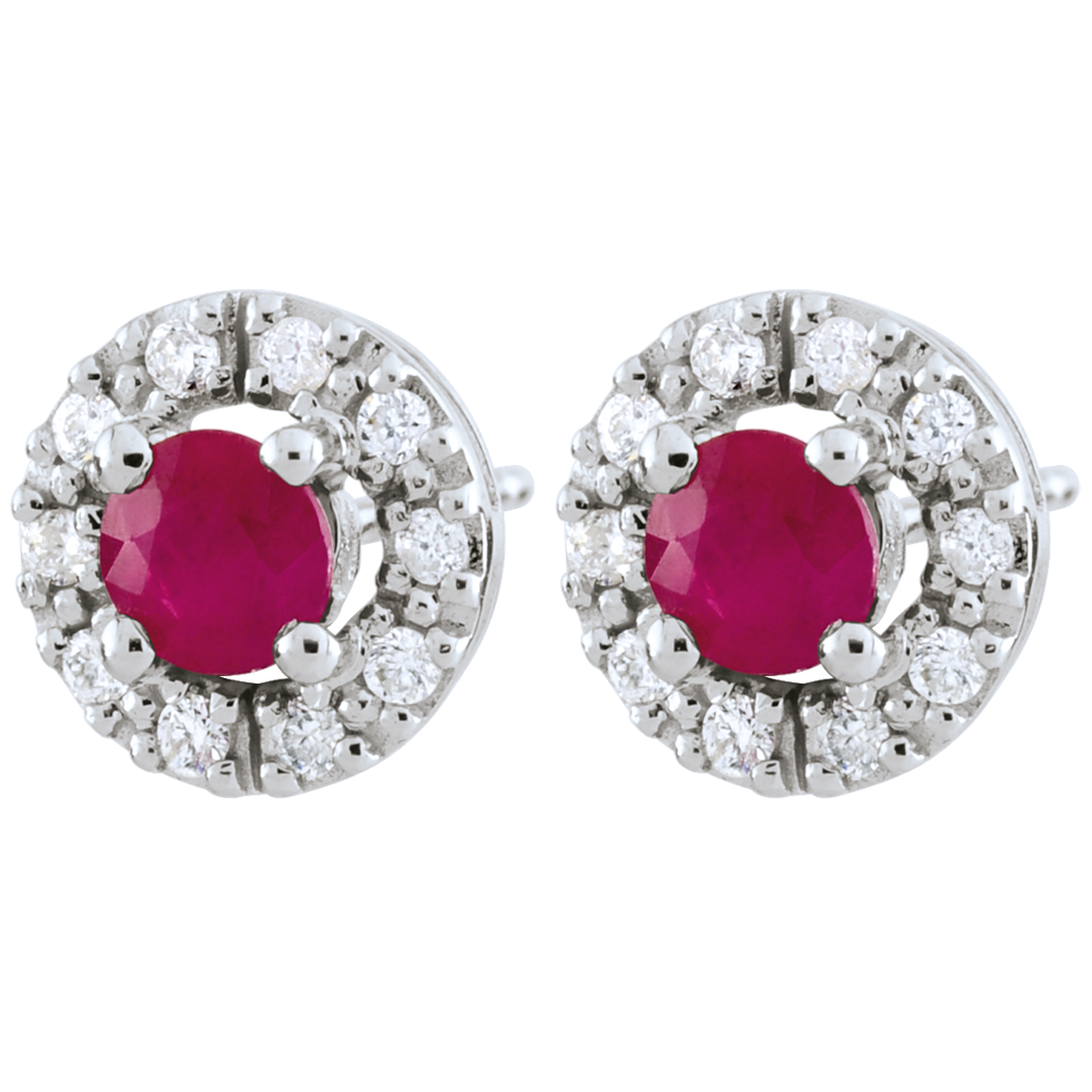 Ein mit Diamanten besetzter Kreis lässt einen Rubin erstrahlen. 20 Diamanten : 0.12 Karat - Weißgold (750/-): 1.5 g. Rubin : 2 - Total: 0.48 Karat Weitere Abmessungen