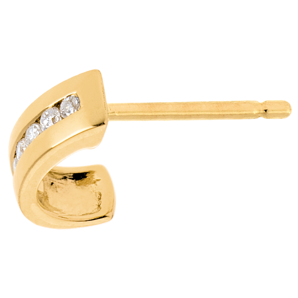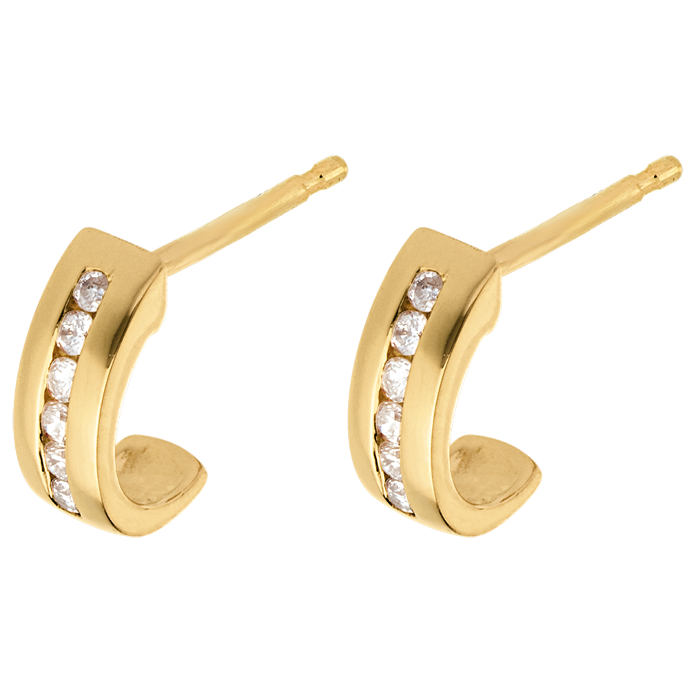 Gelbgoldene Halbcreolen auf denen funkelnde Diamanten in einer Kanalfassung aneinandergereiht sind.