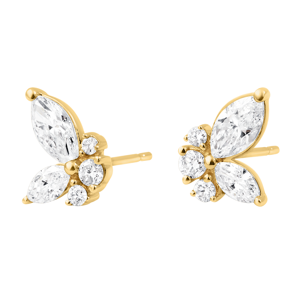 Die "Mitternachtsfalter" Ohrstecker aus 9K Gelbgold sind mit zehn synthetischen Diamanten in Marquise- und Rundschliff kunstvoll als Schmetterling arrangiert.