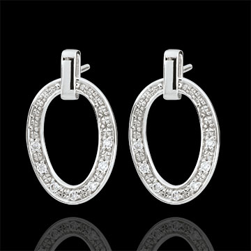 Zwei ovale Kreise mit funkelnden und wertvollen Diamanten besetzt bilden ein Paar Ohrstecker. Fein und elegant, funkeln sie bei jeder Bewegung auf. 14 Diamanten : 0.08 Karat - Weißgold (375/-): 1.3 g. Weitere Abmessungen