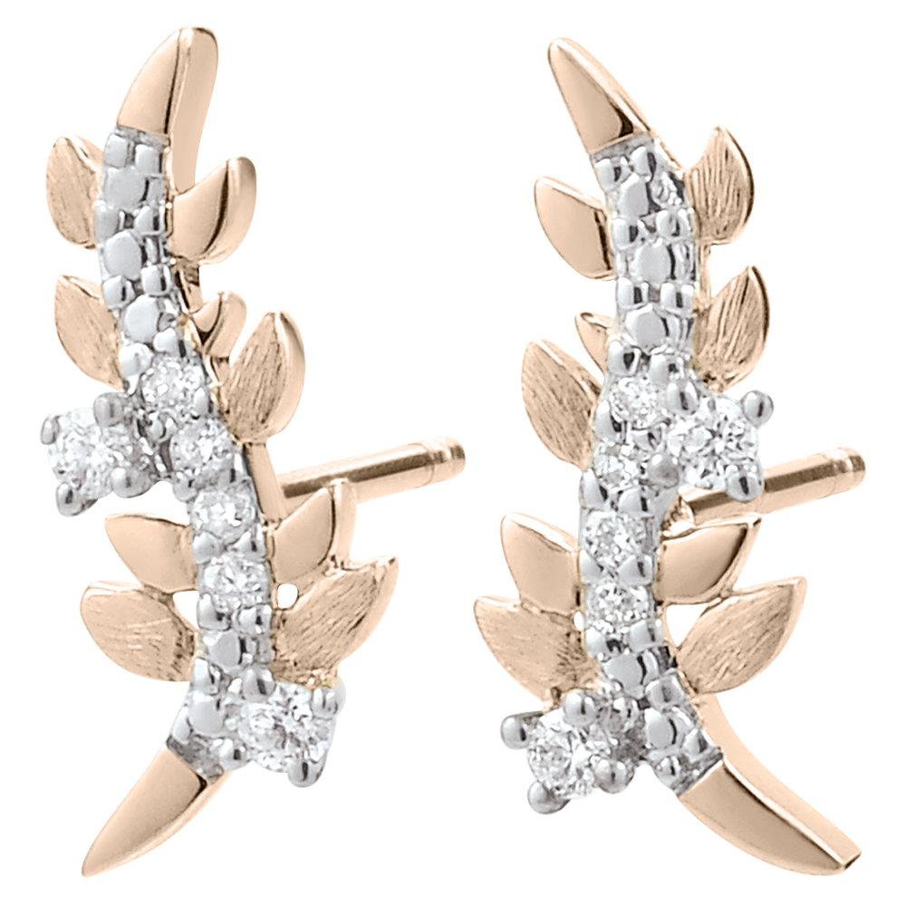 Ein romantisches Zusammenspiel aus glänzendem und eismattem Roségold, welche sich in den verschiedenen Blattformen dieser mit zwölf Diamanten besetzten Ohrringe wiederfinden. 12 Diamanten : 0.07 Karat - Rotgold (750/-): 1.1 g. Weitere Abmessungen